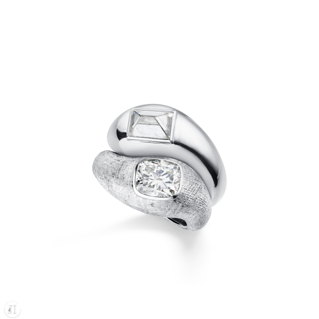 There is a moment when two elements recognise one another, shapes drawn together by instinct, stones suspended in a moment of romance: one polished and perfect, the other raw and untamed.