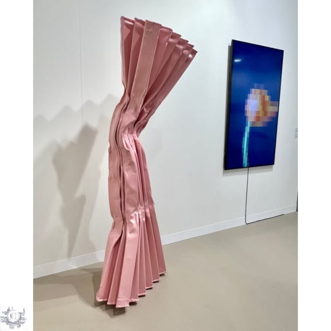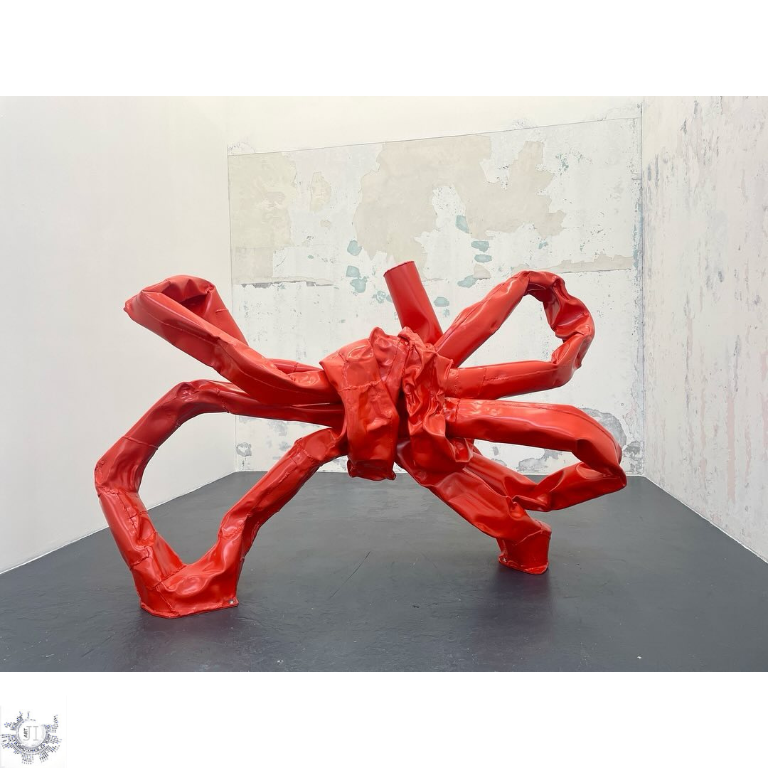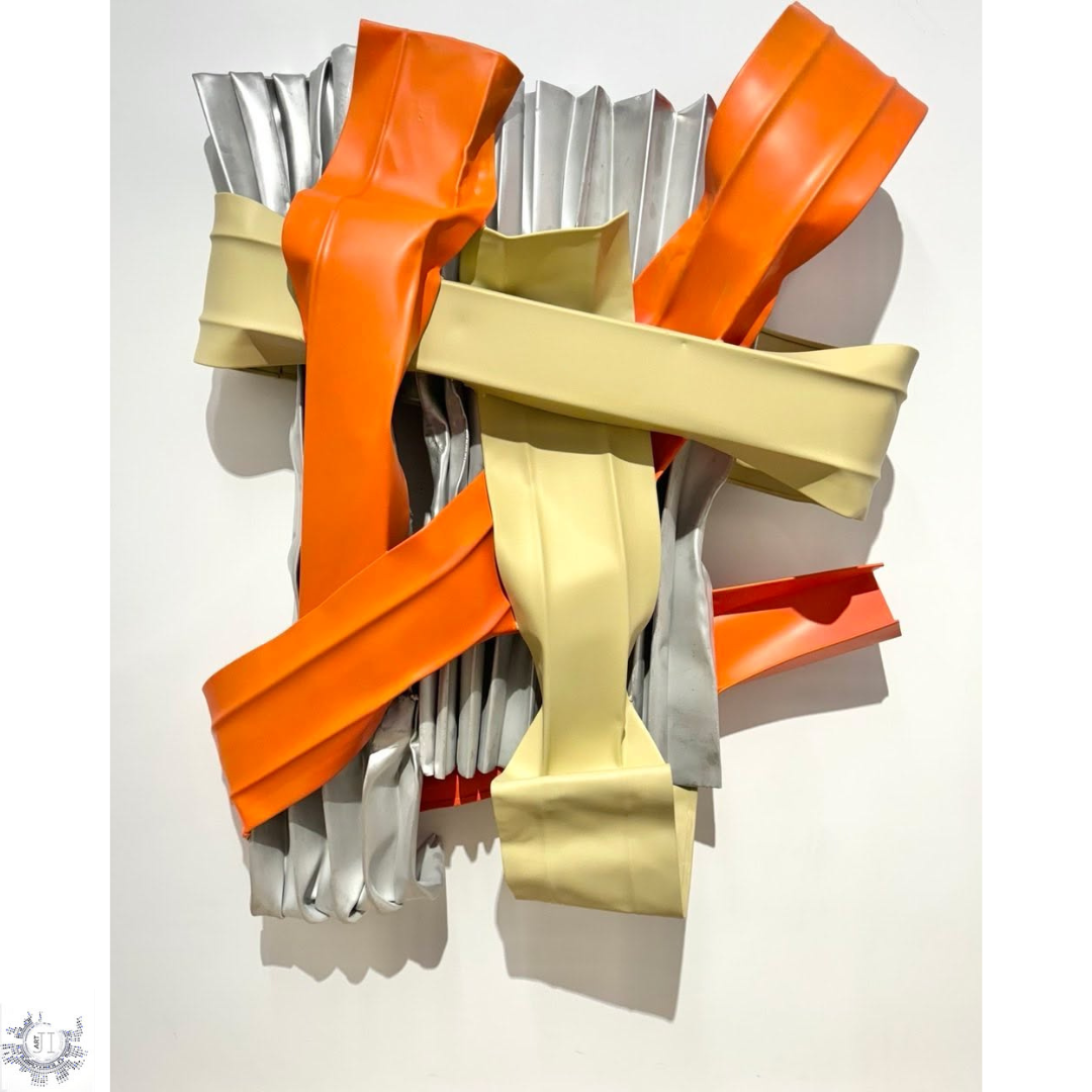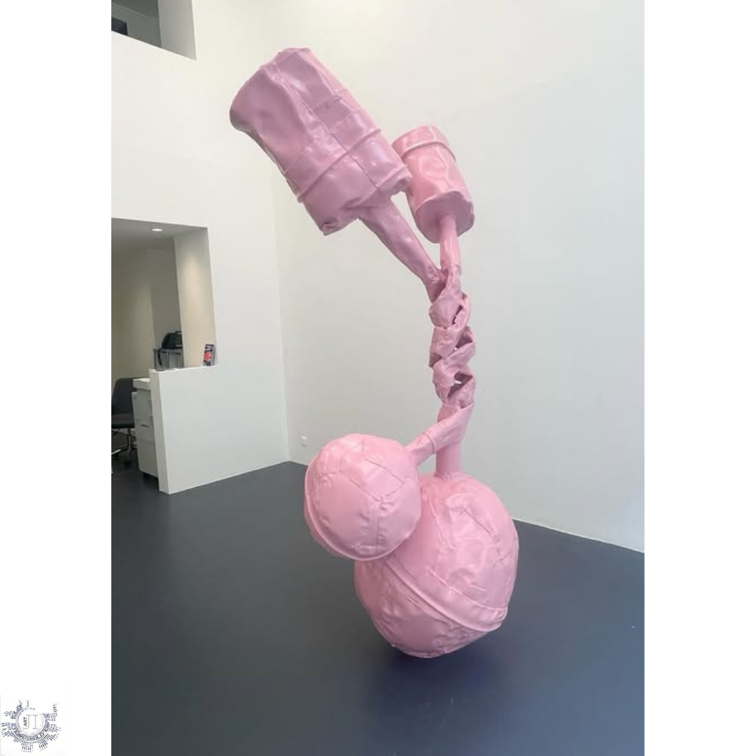 Her brightly colored aluminum structures initially suggest oversized everyday objects: straws, sticks, gigantic, bent barbells, fragments of familiar things. However, their warped geometry and compressed surfaces introduce tension beneath and beyond the playfulness.