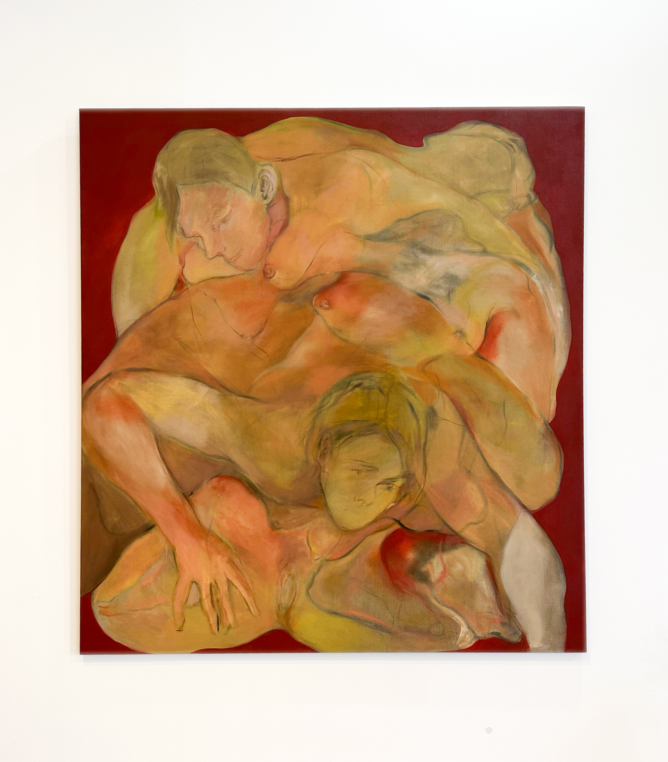 Her paintings gather weight slowly, like a body holding tension without knowing when it started. Paint thickens, figures hunch or coil, surfaces soften and resist, looking feels intimate and slightly off-balance.
